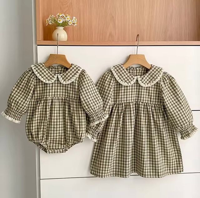 オリーブチェックセーラーカラーワンピース・ロンパース