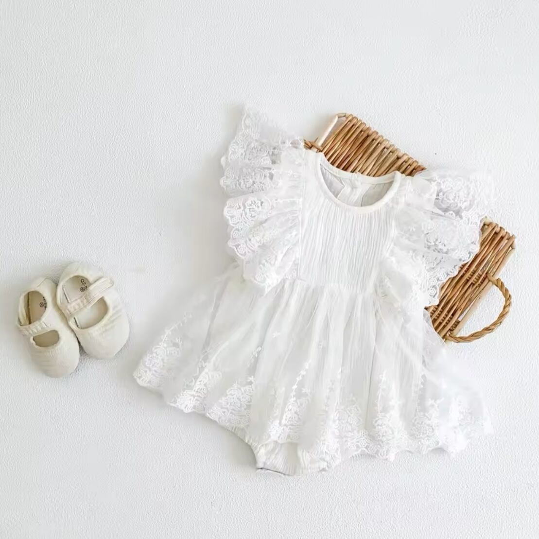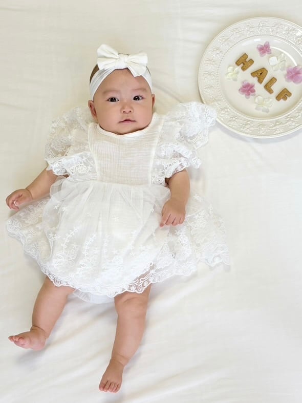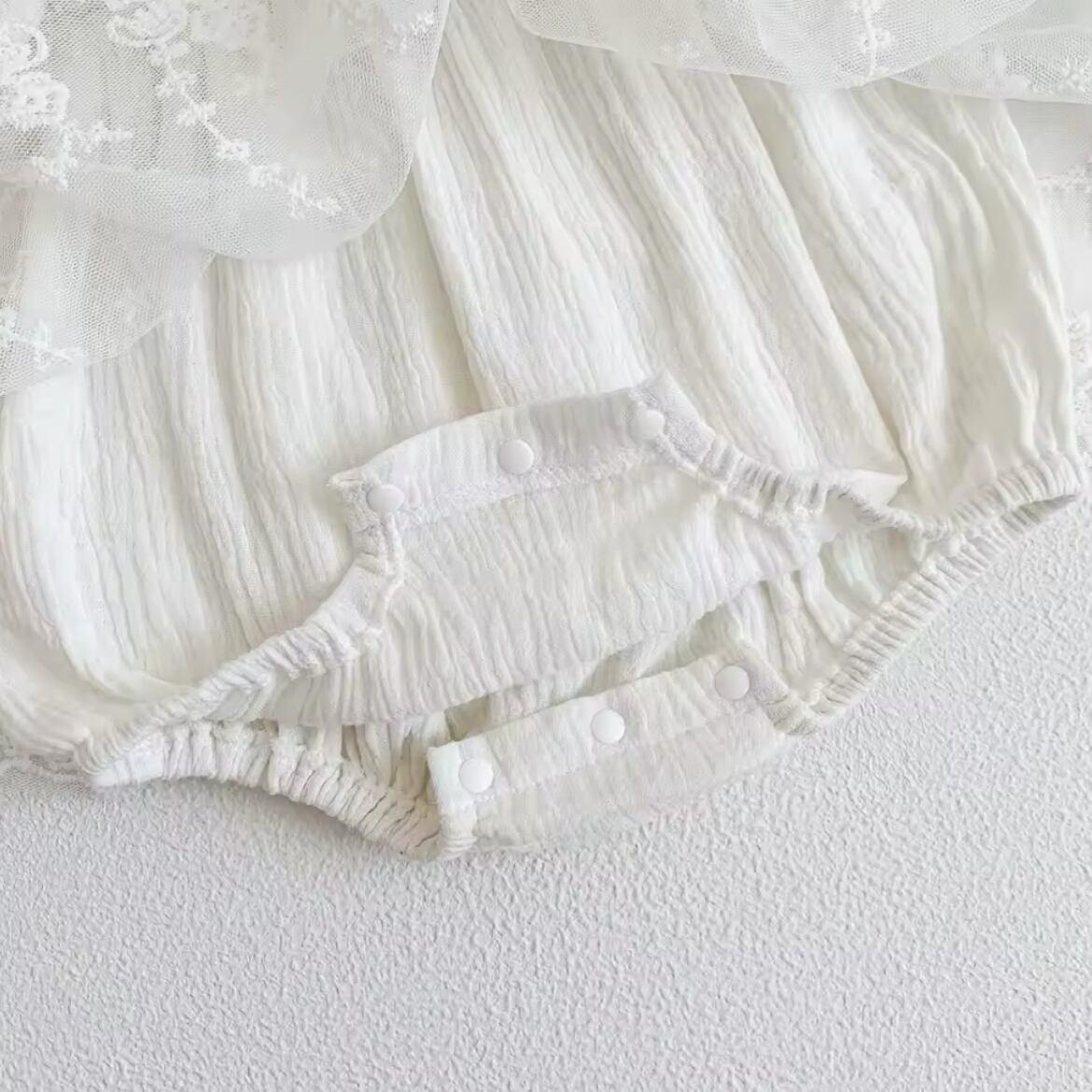 レースフリルロンパースは、繊細なレースと華やかなフリルが特徴のかわいらしいロンパースです。