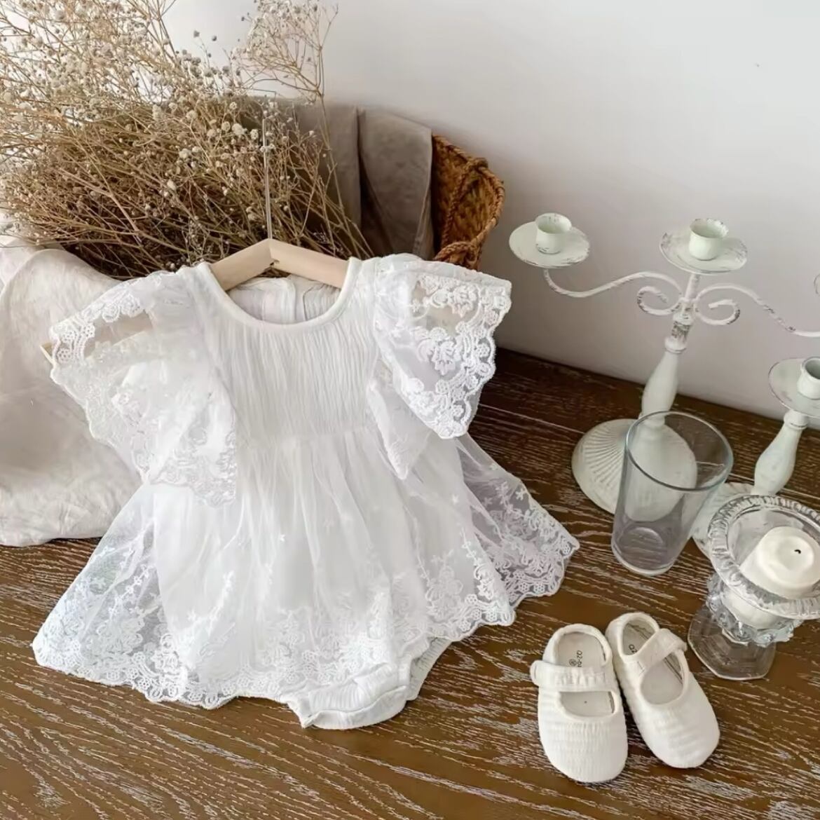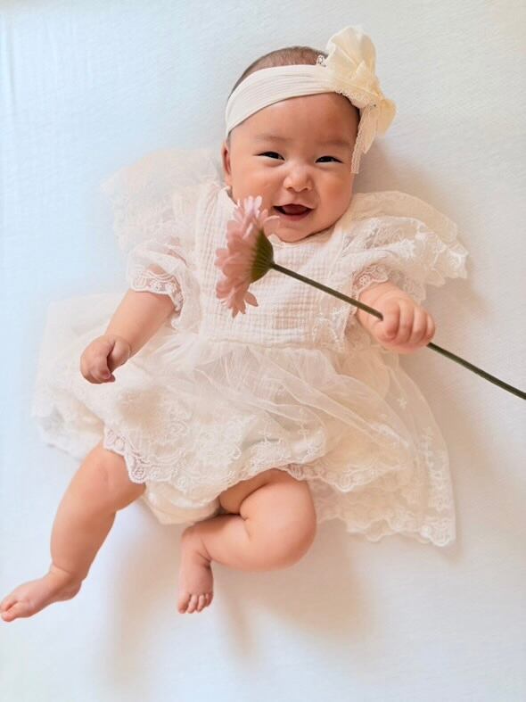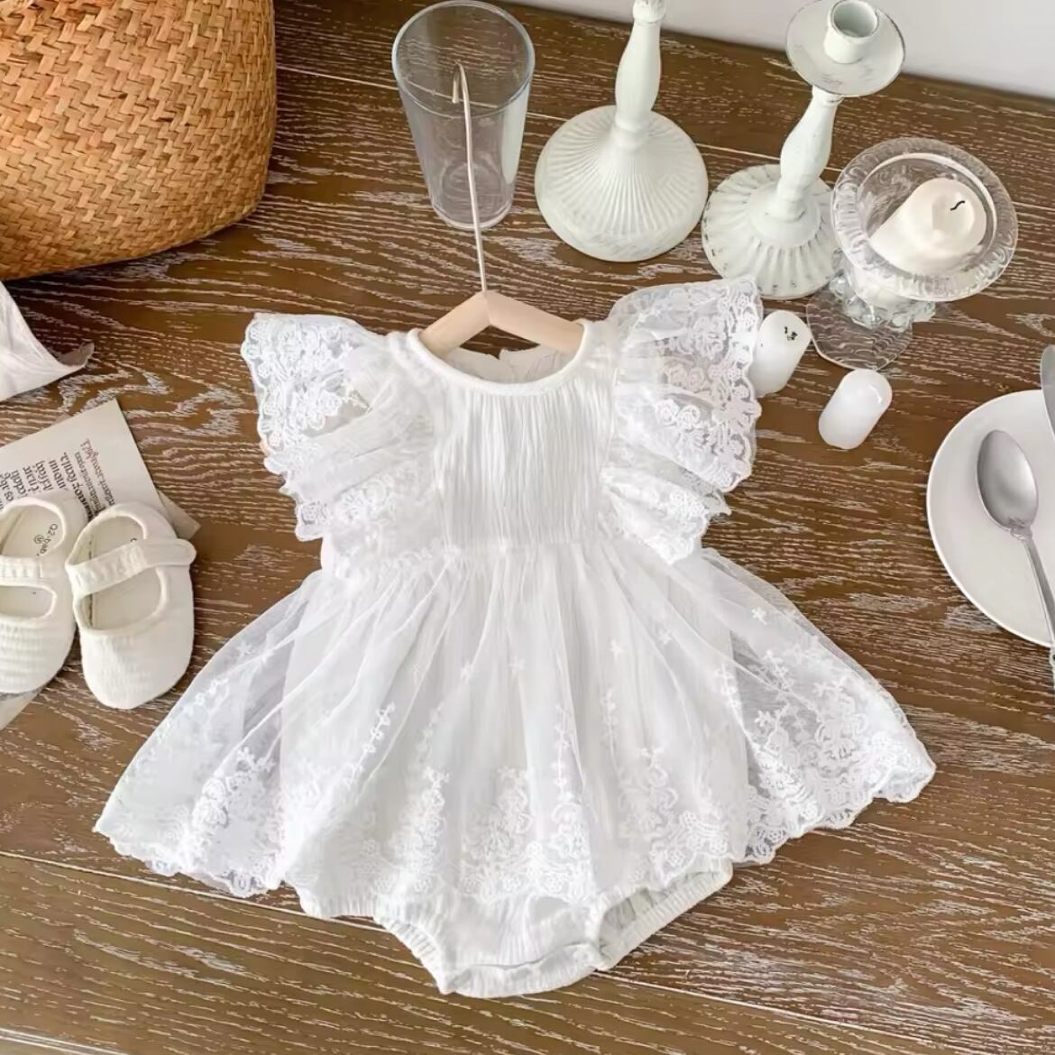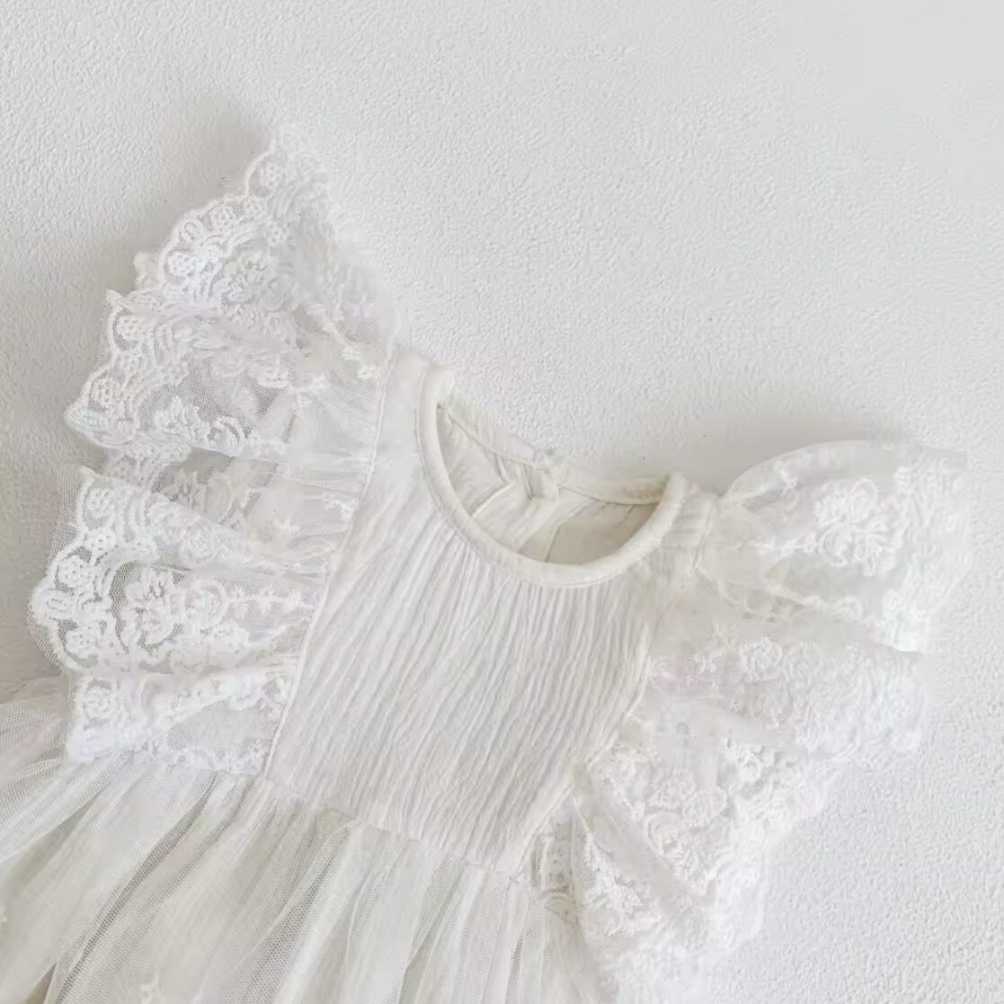 レースフリルロンパースは、繊細なレースと華やかなフリルが特徴のかわいらしいロンパースです。